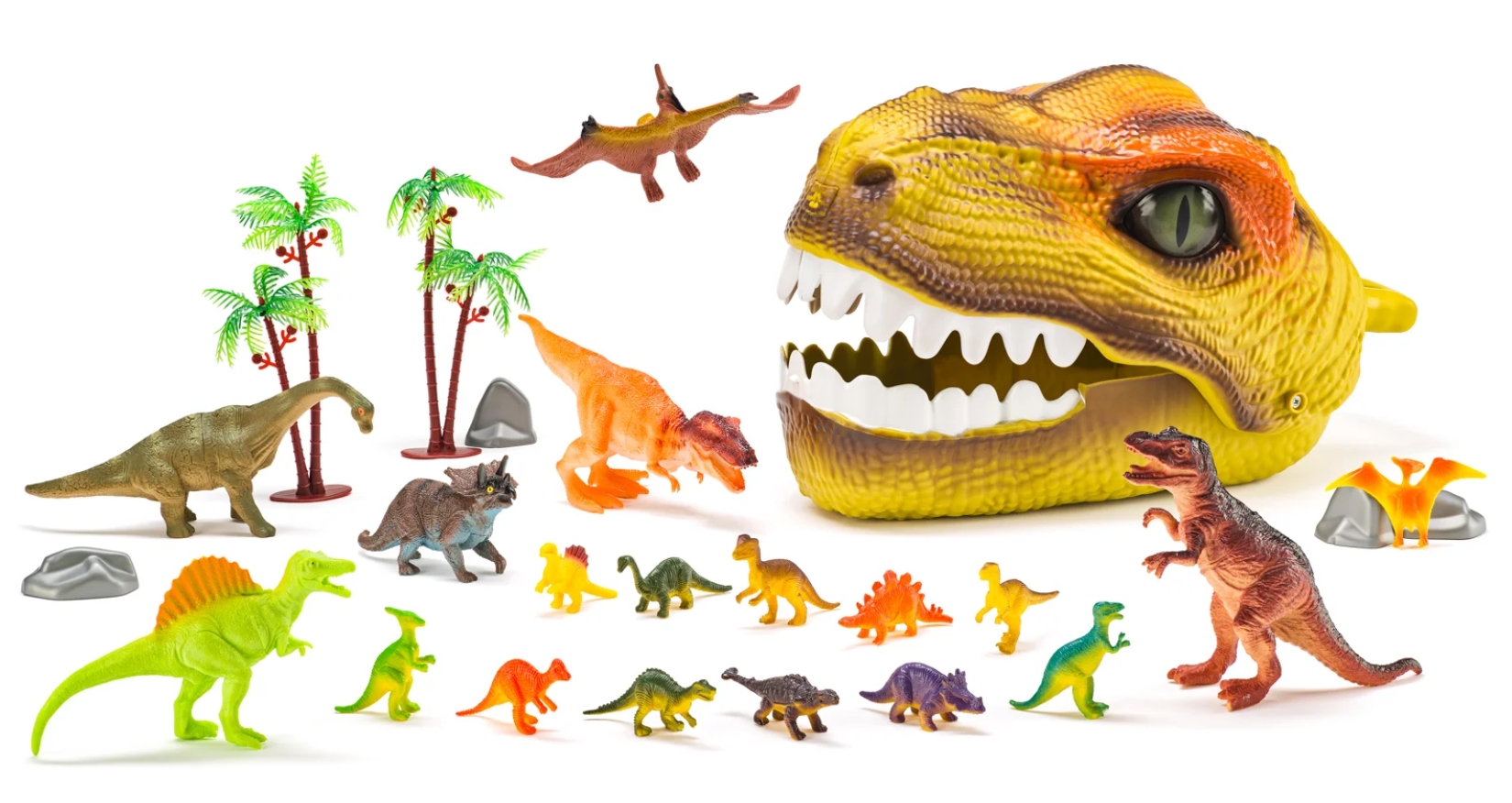 Vydejte se do pravěku s fantastickou Dinosauří hlavou ukrývající figurky a doplňky. Tento kompletní herní set s 25 díly přináší nekonečné dobrodružství pro všechny malé milovníky dinosaurů. Dinosauří hlava slouží jako praktický úložný box – pojme všechny figurky i doplňky a díky madlu ji děti snadno kamkoliv přenesou. Stačí stisknout tlačítko pod čumákem a tlama se otevře – hra může začít! Díky click systému lze dinosauří tlamu otevřít v několika úhlech. Uvnitř najdete pestrobarevnou sadu dinosaurů a doplňků, které vytvoří v dětském pokojíčku úžasnou pravěkou scénérii. Celý set je zabalen v open boxu s vnitřním potiskem prehistorické krajiny, který lze využít jako součást hry nebo originální výstavní dekoraci. Obsah sady: 1 x dinosauří hlava, 3 x figurka dinosaurus 11–16 cm, 3 x figurka dinosaurus 10–14 cm, 12 x figurka dinosaurus cca 5 cm, 4 x skalní útvar, 2 x strom. Vyrobeno z kvalitního plastu. Rozměry hlavy: 17 x 18 x 31 cm. Rozměry balení: 22 x 32 x 19 cm. Nevhodné pro děti do 3 let. Věk: 3+