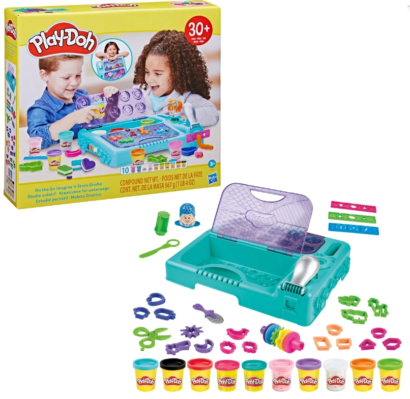 Play-Doh Kreativní sada. Kufřík obsahuje více než 30 modelovacích nástrojů a 10 kelímků Play-Doh 56 g, včetně 2 kelímků růžové a bílé modelíny s konfetami a 2 kelímků červené a zelené třpytivé modelíny. Najdete zde Továrnu na zábavu a Kadeřnictví, spoustu vykrajovátek a nejrůznějších vychytávek, tak se nebojte popustit uzdu fantazii. Na vše je zde spousta prostoru, takže kelímky s modelínou můžete dát do připravených otvorů, tvořítka a vykrajovátka do zásobníku, na němž je kryt s texturou, se kterým si užijete spoustu zábavy při vytváření parádních vzorů. Kompletní balení je praktické, vejde se vám do něj všechno potřebné a díky kompaktní rukojeti si ho můžete vzít pohodlně na cesty. Rozměry balení: 33 x 36,8 x 8,1 cm. Věk: 3+