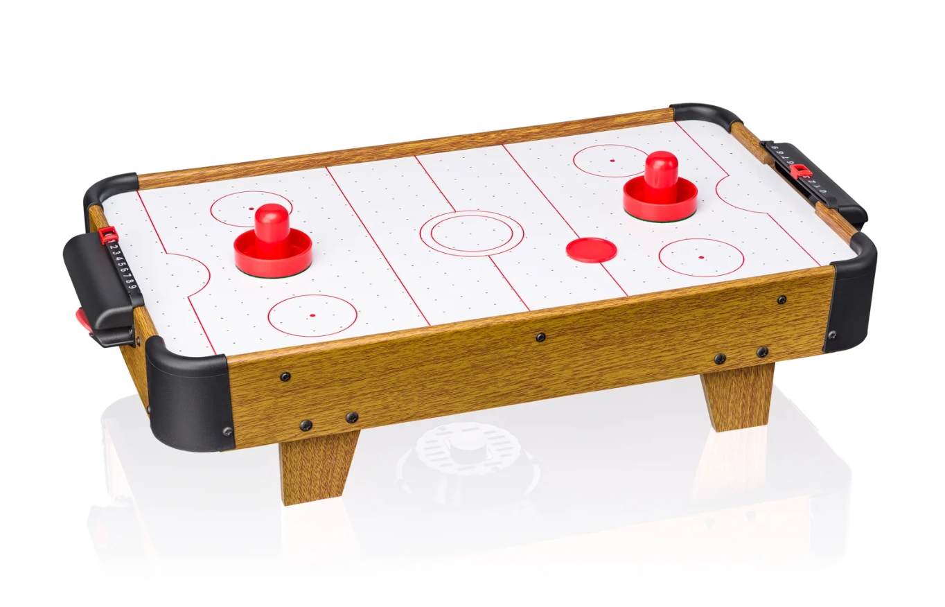 Prověří postřeh a hbitost hráčů. Díky vzduchu vháněnému zespodu vestavěným ventilátorem může puk hladce, ale hlavně bleskurychle klouzat po hrací ploše. Hráči mají k dispozici speciální pálky, kterými se snaží vstřelit puk do soupeřovy branky. Pálky jsou ve spodu opatřeny plstí pro snadný a bezhlučný pohyb. Rychlá akční hra pro 2 hráče. Baterie: 3 x AA (nejsou součástí). | Věk. 3+ | Rozměr: 57 x 30 x 12,5 cm