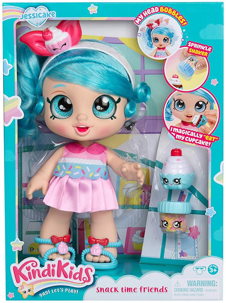 Jessicake - panenka s okouzlujícími modrými vlasy. Miluje mražené cupcaky. 2 interaktivní doplňky - cupcaky. Přibliž cupcake ke rtům panenky a uvidíš jak panenka ´´sní´´ višeň. Velikost panenky: 30 cm. Série 1. Oblečení a boty lze sundat. Na kanálu Youtube můžete sledovat dobrodružství Kindi Kids. Kindi Kids jsou nádherné panenky s krásnými barevnými vlasy a velkýma třpytivýma očima. S každým pohybem pohybují hlavami. Takže když vezmeme panenku do náručí téměř "ožije". V balení s interaktivním příslušenstvím. Rozměr balení: 25 x 34 x 13,5 cm. Věk: 3+