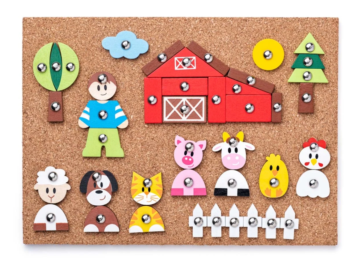 Děti dovedou z této stavebnice, pomocí kladívka a hřebíčků, vytvořit nekonečné variace obrázků plných fantazie na téma zvířátka a lidé. Práce se stavebnicí podporuje představivost, soustředění a přesnou koordinace pohybů. Obsahuje: 1 korkovou desku, 2 dřevěná kladívka, 80 hřebíčků a 70 dřevěných tvarů. Návrh a design českého autora. Počet dílků: 150. Rozměr desky: 0,8 x 23 x 16,5 cm. Rozměry balení: 22,3 x 28,1 x 4 cm. Věk: 5+