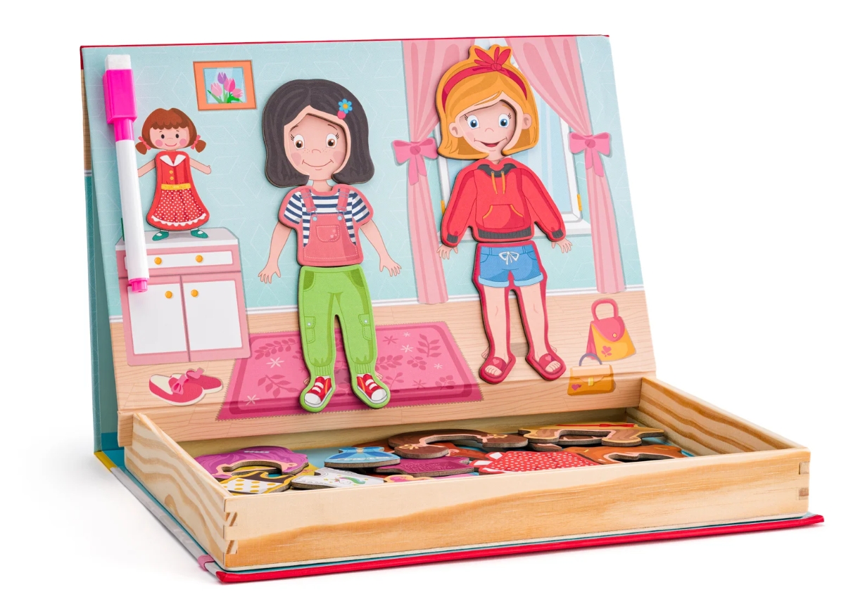 Stylová zábava pro malé módní návrhářky! Otevři dřevěnou krabičkou plnou magnetických oblečků a vytvoř dokonalé outfity pro dvě holčičky na magnetickém víku. Kombinuj trička, sukně, kalhoty, šaty i účesy – a nezapomeň obléct i jejich panenku! Inspiruj se přiloženými kartičkami s modními tipy. Věk: 3+| Rozměr: 27 x 20 x 4 cm | Počet ks: 39