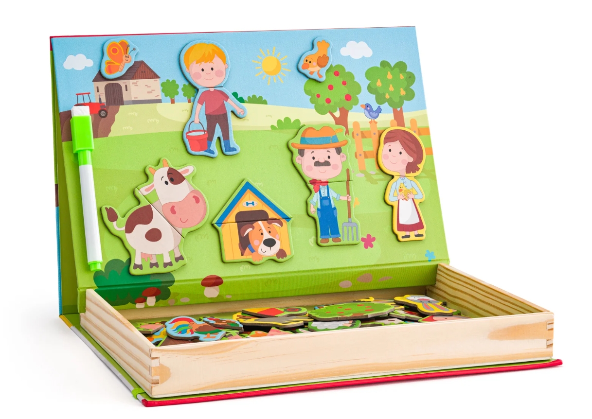S touto kouzelnou magnetickou skládačkou si můžeš vytvořit svou vlastní farmu! Dřevěná krabička je plná zvířátek, lidiček, domečků a dalších prvků s motivem farmaření. Každý motiv se navíc musí poskládat z více částí. Dítě je umisťuje na magnetické víko s obrázkem statku a louky. Rozvíjí tak kreativitu a jemnou motoriku.| Věk: 3+ | Rozměr krabičky: 27 x 20 x 4 cm | Počet ks: 64