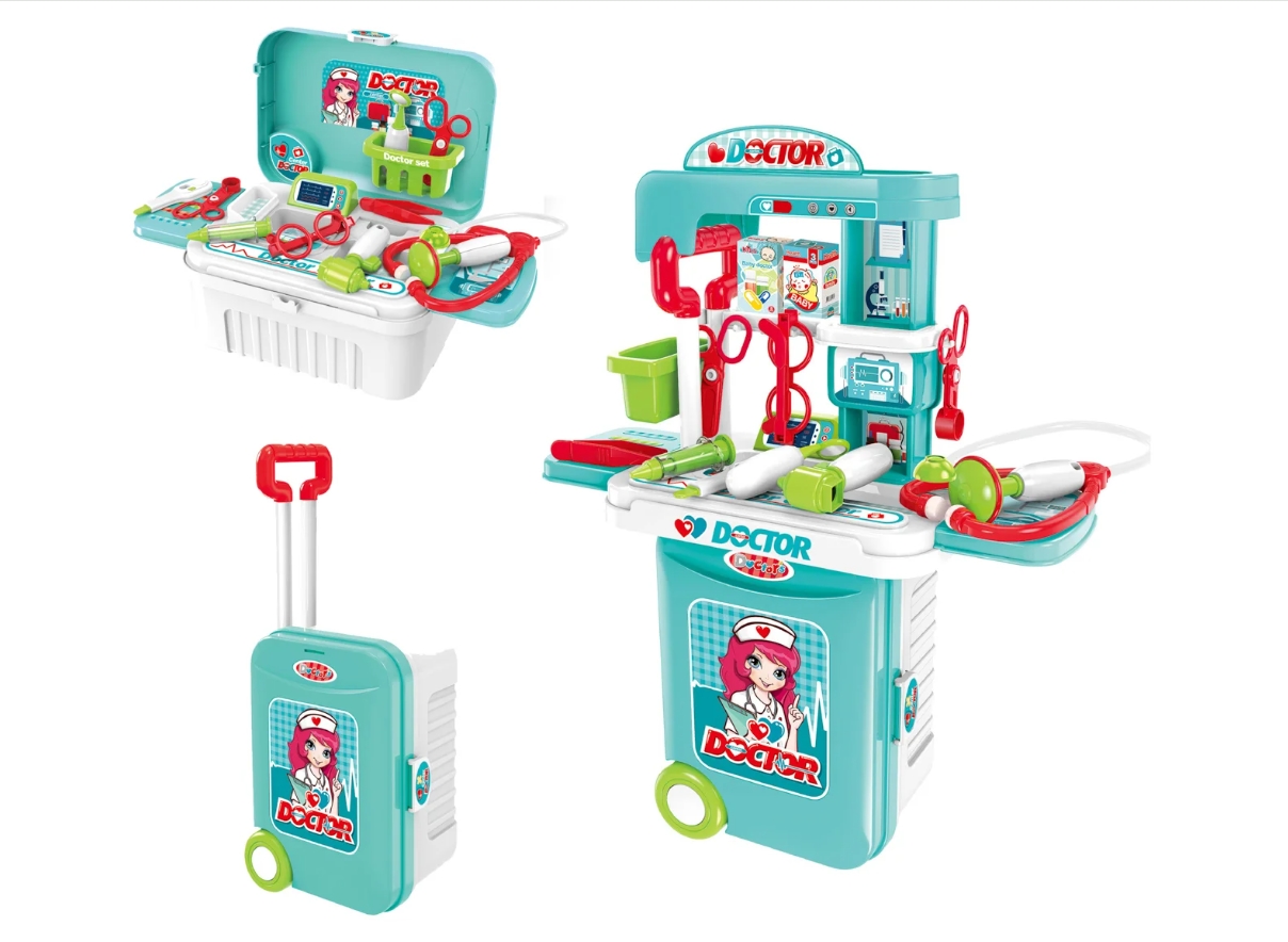 Lékařská ordinace v kufříku – skvělá hračka pro malé doktory. Kufřík na kolečkách s vysouvacím madlem (výška 55,5 cm, se zasunutým madlem 38 cm). Kufřík lze přestavět na ordinaci o rozměrech 66 x 50 x 21 cm. Součástí vybavení jsou brýle, nůžky, injekce, teploměr a další příslušenství. Rozměry balení: 24,2 x 37,7 x 17 cm. Věk: 3+