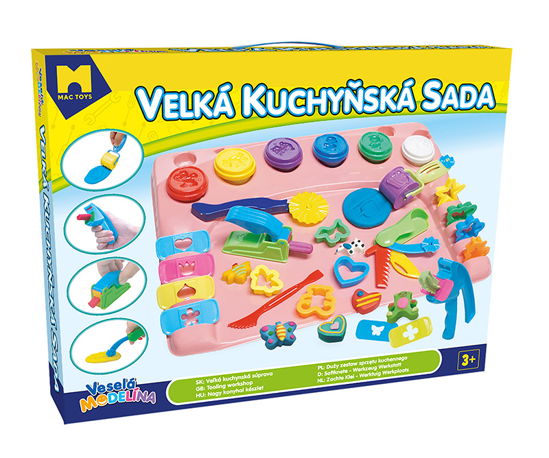 Báječná velká kuchyňská sada s 12-ti kelímky různě barevné modelíny, válečkem a velkým množstvím tvořítek pro malé výtvarníky, aby si mohli vytvořit krásné barevné výtvory - např. autíčko, domeček se zahrádkou, letadlo nebo cokoliv jiného podle vlastní fantazie.