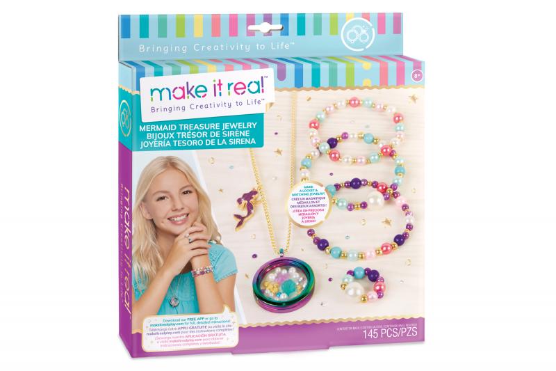 Náhrdelník a náramky, medailonek. Obsahuje: kovový medailon, 60 zlatých korálků, 50 plastových korálků, 45 plastových perel, 30 miniaturních perel a korálků, průhlednou elastickou šňůru (1m).