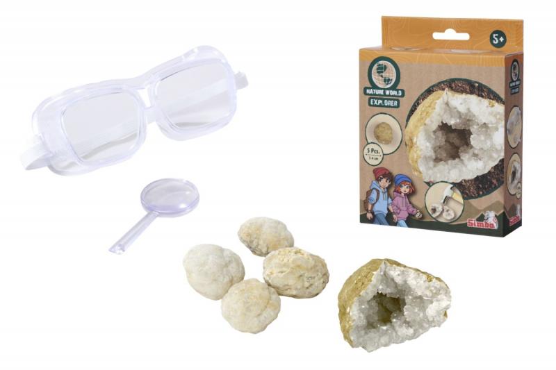 Sada na objevování geod, 5 ks opravdových geod o velikosti 3-4 cm. Součástí jsou ochranné brýle a lupa.