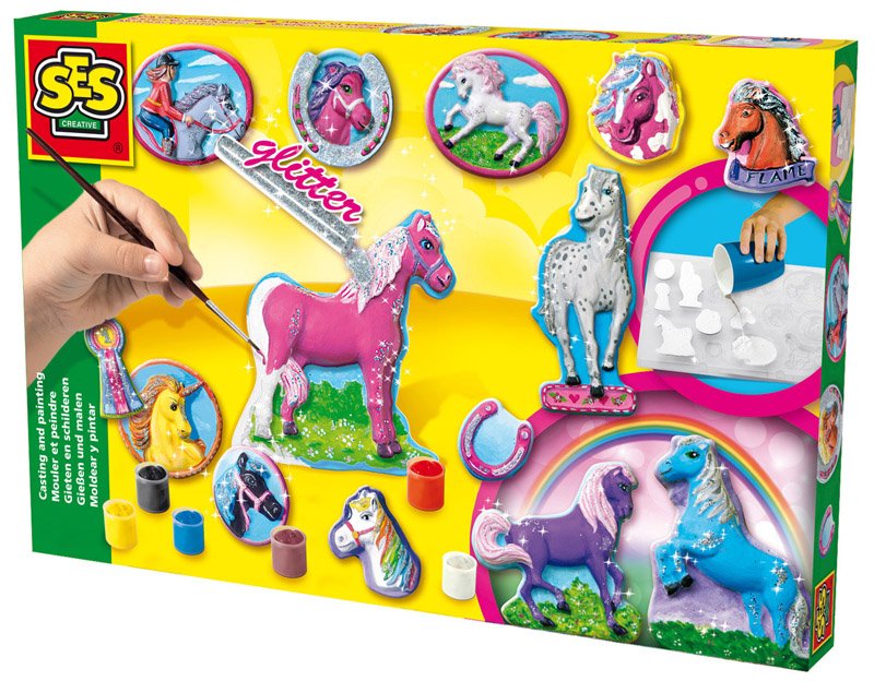 Velká reliéfní forma pro odlévání s motivy koní. Pomocí této sady můžete vyrábět přívěsky, magnety, nebo dárky pro Vaše nejbližší. Sada osahuje sádru, barvy, štětec a třpytky. Formy lze použít opakovaně. Doporučujeme však použít sádru SES. Věk: 5+