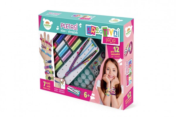 Kreativní sada obsahuje pletací stav, příze, spojovací knoflíčky a samolepky. Děti si mohou uplést 12 náramků a vybrat si mohou ze 7 stylů uzlů. Rozměry balení 38 x 38 x 6 cm Vhodné pro děti od 6 let.