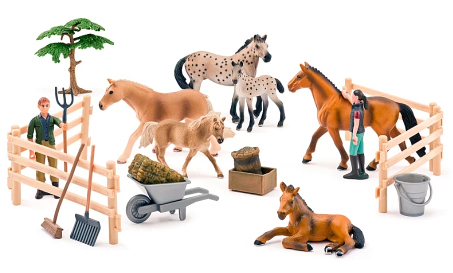 Krásná hrací sada, která je opravdu plná koní! Najdete v ní 3 dospělé koně a 3 hříbata, 2 ošetřovatele a spoustu dalšího příslušenství. Věk: 3+