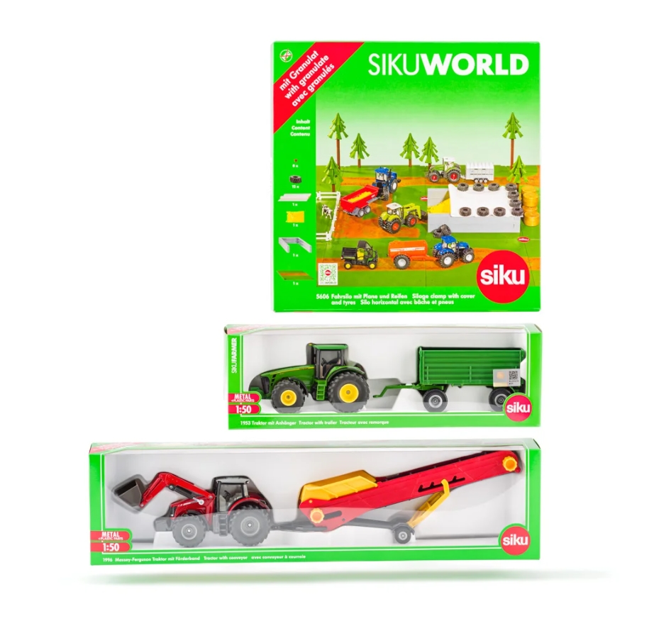 LIMITOVANÁ EDICE – SIKU Super - set zemědělské stroje B: Traktor John Deere s vlekem (1953) + Traktor s dopravníkem (1996) + Siláž s granulátem s krytem z pneumatik (5606). Rozšiřte svou sbírku traktorů o model JOHN DEERE 8430 s přívěsem! Traktor je vytvořen v měřítku 1:50 a je možné k němu připojovat všechno příslušenství v daném měřítku. Kabinu traktoru lze demontovat. Vyrobeno z kovu s plastovými detaily. Věk: 3+. Rozměr: 263 x 56 x 68 mm. Traktor Massey Ferguson MF8680 s pásovým dopravníkem. S čelním nakladačem a obrovskou lopatou má traktor Massey Ferguson impozantní vzhled. Čelní nakladač je výškově nastavitelný a úhel sklonu lopaty lze měnit. K přívěsu je připojen velký dopravní pás s tažným zařízením. Dopravní pás je výškově nastavitelný a má mechanický rotační pohon. Měřítko: 1:50. Rozměr: 416 x 59 x 82 mm. Skladujte sklizenou kukuřici v tomto krytém silu. Už nemusíte mít strach, že vám zmokne úroda. Zakryjte kukuřici plachtou a tu zajistěte pneumatikami. A je to! S touto sadou zažijete spoustu zábavy. Vyrobeno z kvalitního a odolného plastu. Balení sila obsahuje: 8 propojovacích desek, 12 x pneumatika, 1x plachta, 1x sáček falešné kukuřice, 1x plot. Rozměr sila: 270 x 270 x 74 mm. Rozměr balení: 46,2 x 28 x 11 cm. Věk: 3+