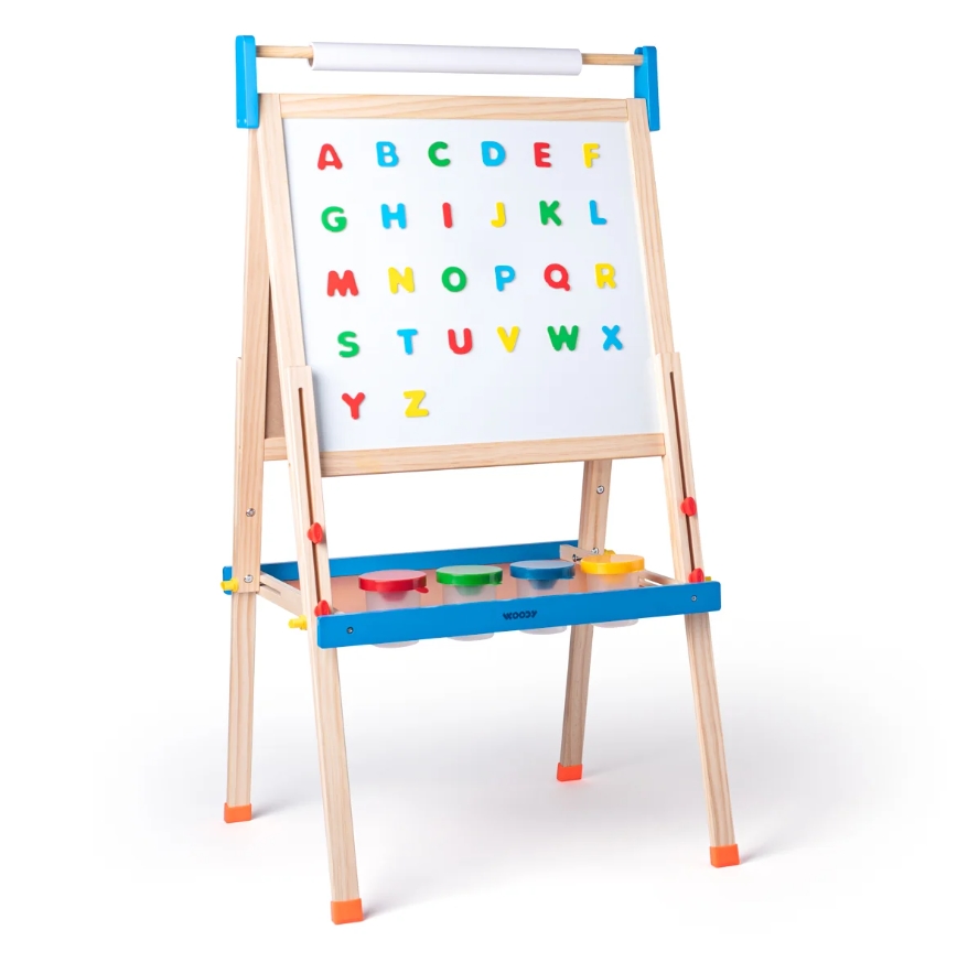 Oboustranná tabule s nastavitelnou výškou. Z jedné strany je zelená plocha pro psaní křídami, z druhé bílá magnetická plocha pro psaní fixou. Nad tabulí je do konstrukce zabudovaná tyčka pro upevnění role papíru, který lze odvíjet a malovat na ploše, kterou poskytují desky tabulí. Obsahuje magnetická písmena, bílé křídy, fix, houbičku a kelímky na vodu a barvy. Obsahuje: 31 dílků. Rozměr: 59 x 57 x výška 111-129 cm. Spodní hrana kreslící plochy: 60-77cm. Rozměr balení: 56,5 x 9 x 71,5 cm. Věk: 3+